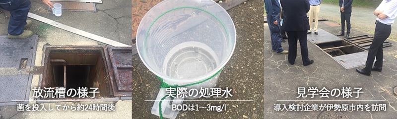 - 放流水を活性汚泥法+当社菌群にて処理。