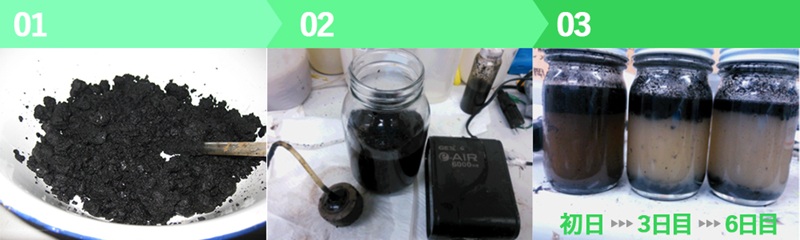 - 好気性菌+通性嫌気性菌を数種類ブレンドし、浄化槽に投入。